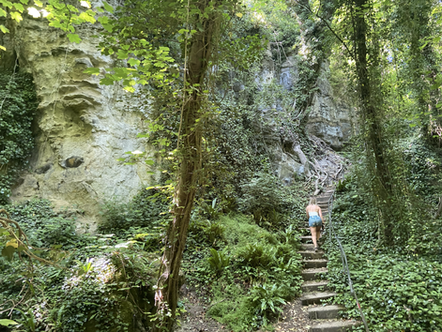 From the coast, walk in the direction away from Ventnor along the Wheelers Bay sea defence. This takes you a fair distance along the coast under towering chalk cliffs, then a path is accessible just before the end beach which cuts up towards Bonchurch. This enters a lovely wooded path alongside running water. Once up to the top of the hill where the church is, turn right back down another path alongside a field. The path then opens up to a few driveways then continues again into a dense woodland onto Ventnor Landslip. This is an incredible landscape to walk through, dotted with windows that look out to sea where there are clearings in the trees, cute old and narrow stepped paths, and curious branches and pre-historic-like vegetation. You can either follow the main, shorter, but just an as nice path through the landslip, or take a diversion up (once past the wooden steps .. there's also a sign) through Devils Chimney. This is one of those gems only those who know of it get to experience it, which makes it all the more special. A brief glance and you'd miss it amongst the foliage, but once you spot it and turn the corner to look up the old rock steps, it's truly a pause and appreciate-how-awesome-it-is moment!